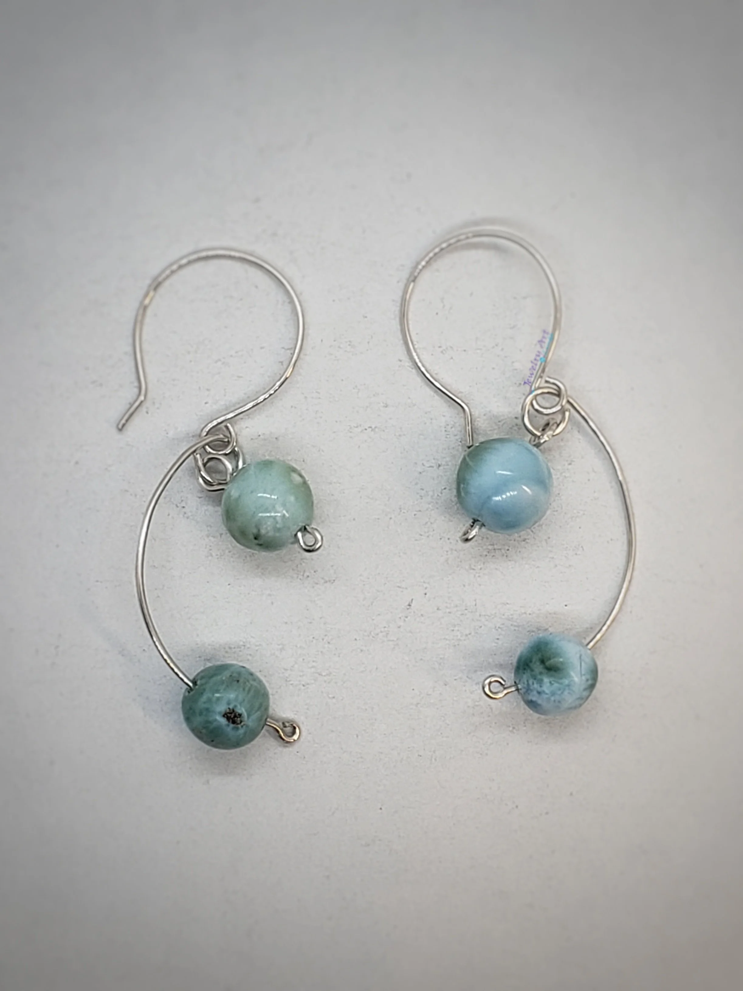 These earrings have great movement and attract attention while you are wearing them. The 9.5mm and 8.5mm larimar beads are suspended from sterling silver wires and hang about 2 inches.