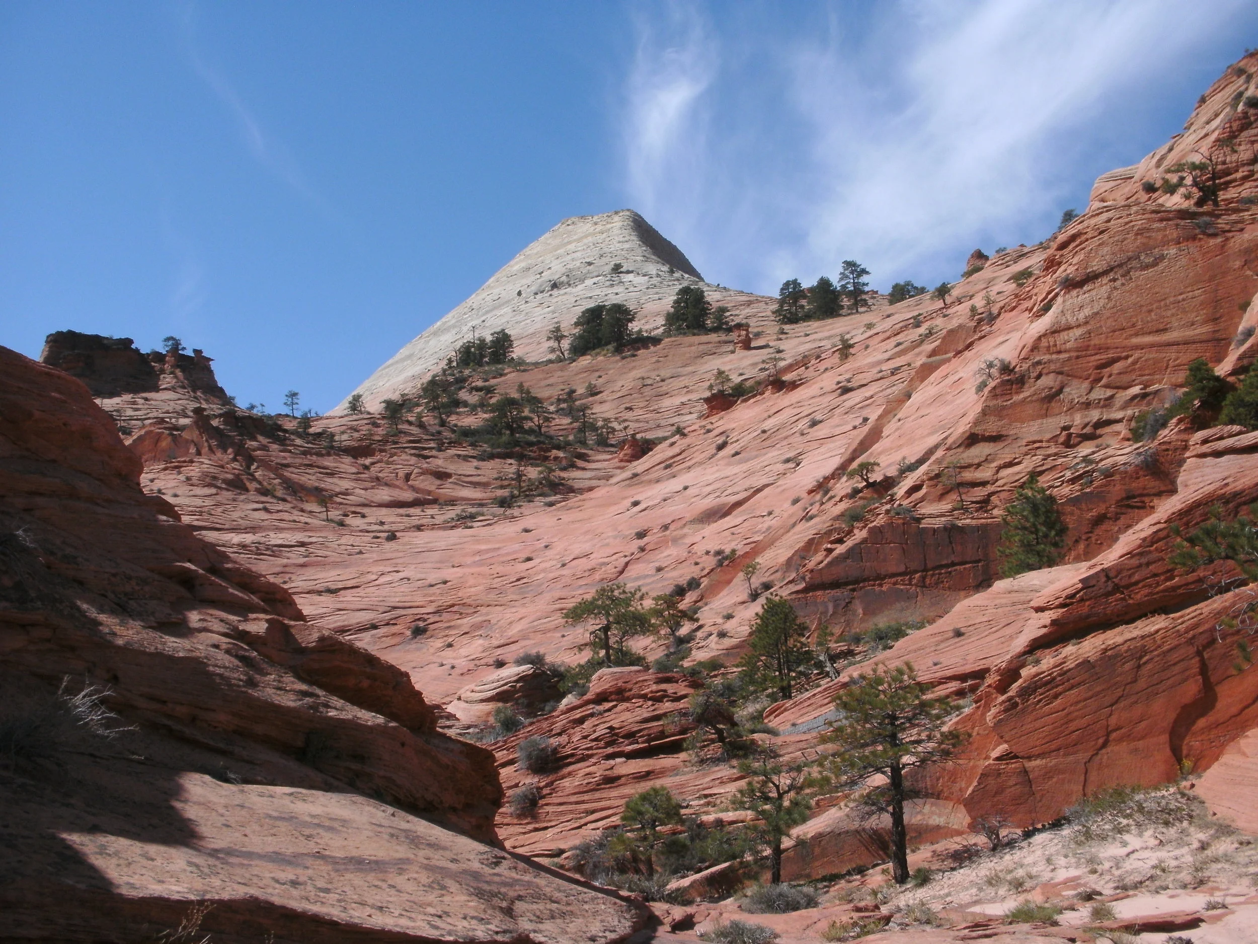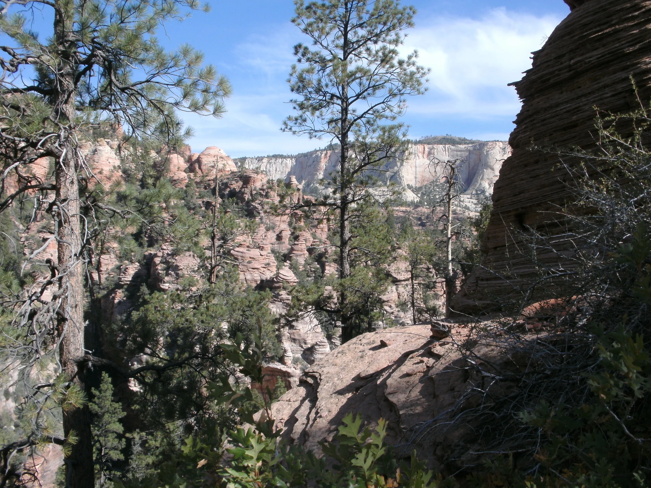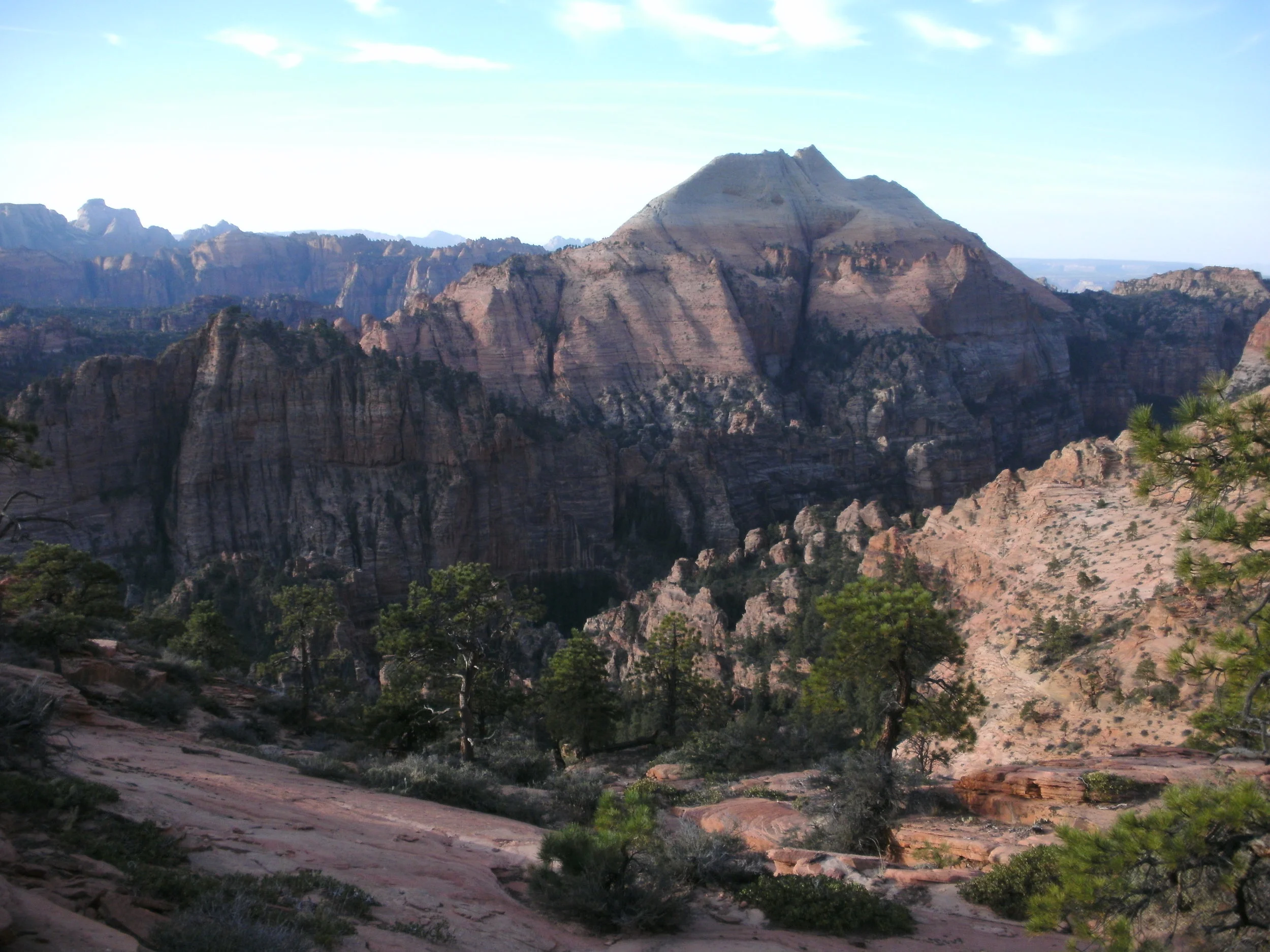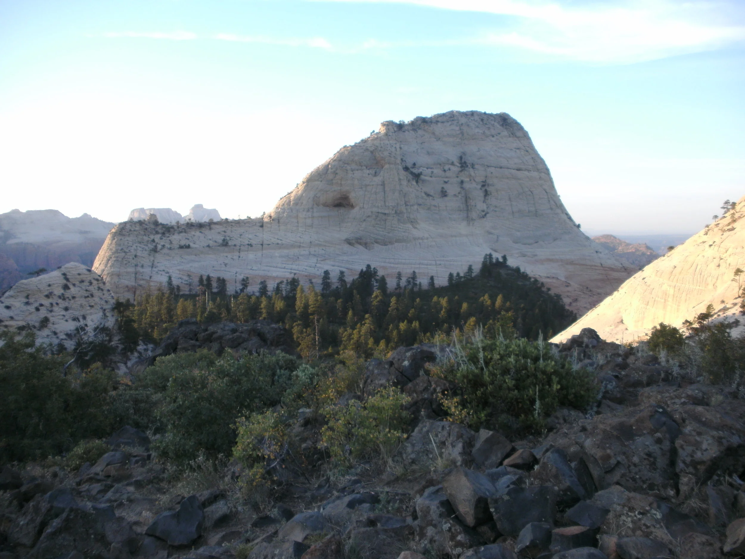 Turning south, begin the long beautiful ascent up South Guardian Angel. The travel is class 2 - 3. Once the sandstone turns white there are several class 3+ areas. None I would consider class 4, again plenty of shelf systems allow for good, solid footing. As the ridgeline gives way to the high summit, continue south skirting the several hoodoos that dot the summit area. A short scramble behind a pine tree and up to the final hoodoo is class 3+. Drop low and horizontal to the ledge system keep it under class 4. Scramble up and the summit of South Guardian Angel is reached. No summit cairn exists, a small pile of rocks protects the summit registration. I signed my name and relaxed. This place! Looking south-southeast the main Zion Canyon is easily spotted. South the road along the ridge by Sunset Canyon Ranch. North Fork creek with glistening water, it is easy to picture hikers looking for the exit ramp. West is the red dome of Tabernacle Peak and further west is the Pine Valley Mountain Wilderness area. Continuing around the compass is Red Butte, the cinder cones of Spendlove and Firepit. White against the blue/green trees, Pine Valley peak is stunning. But the south face of North Guardian Angel, in all its glory, is a wonder to behold. Wildcat, Rams Peak, and Greatheart Mesa.