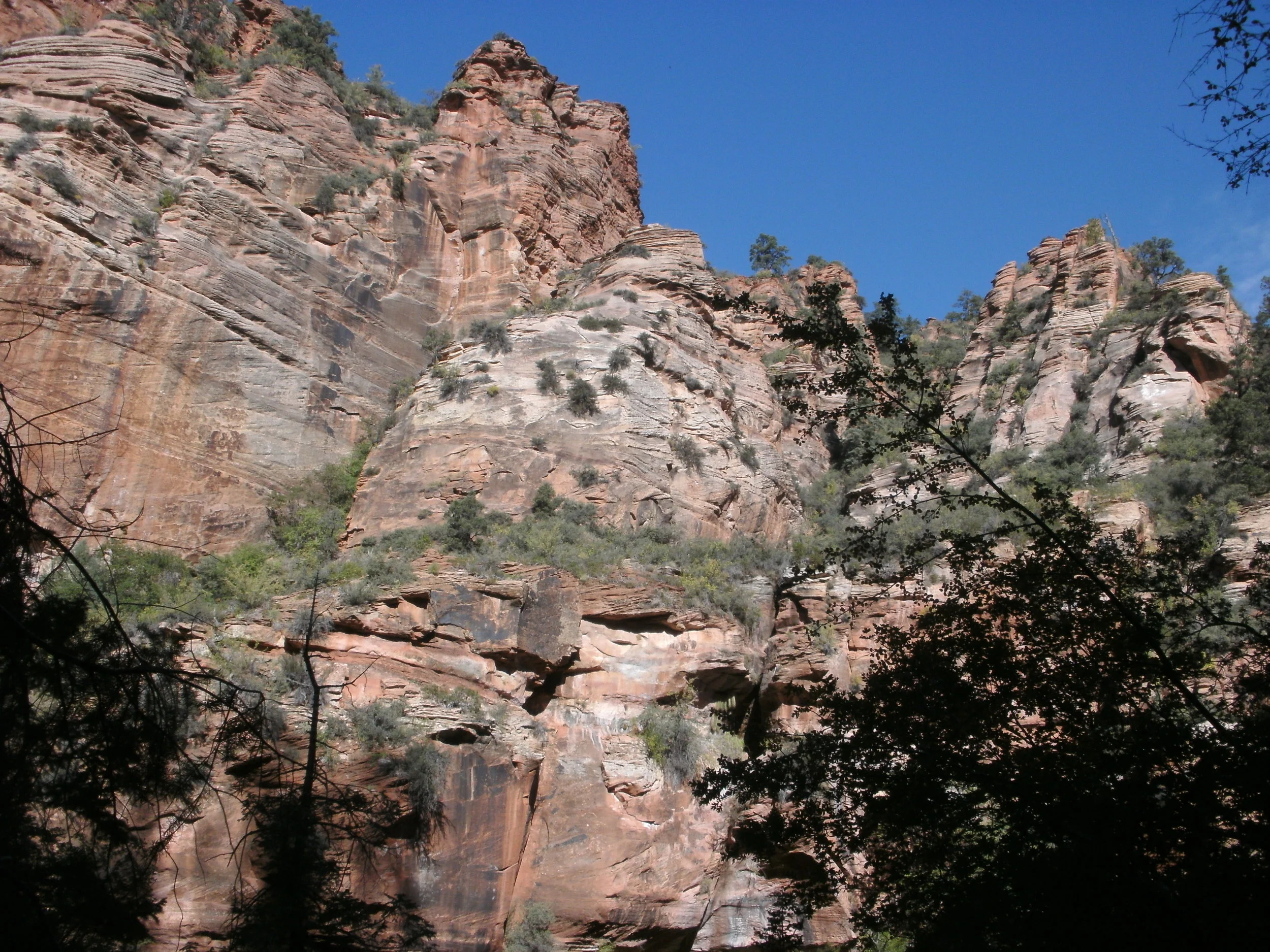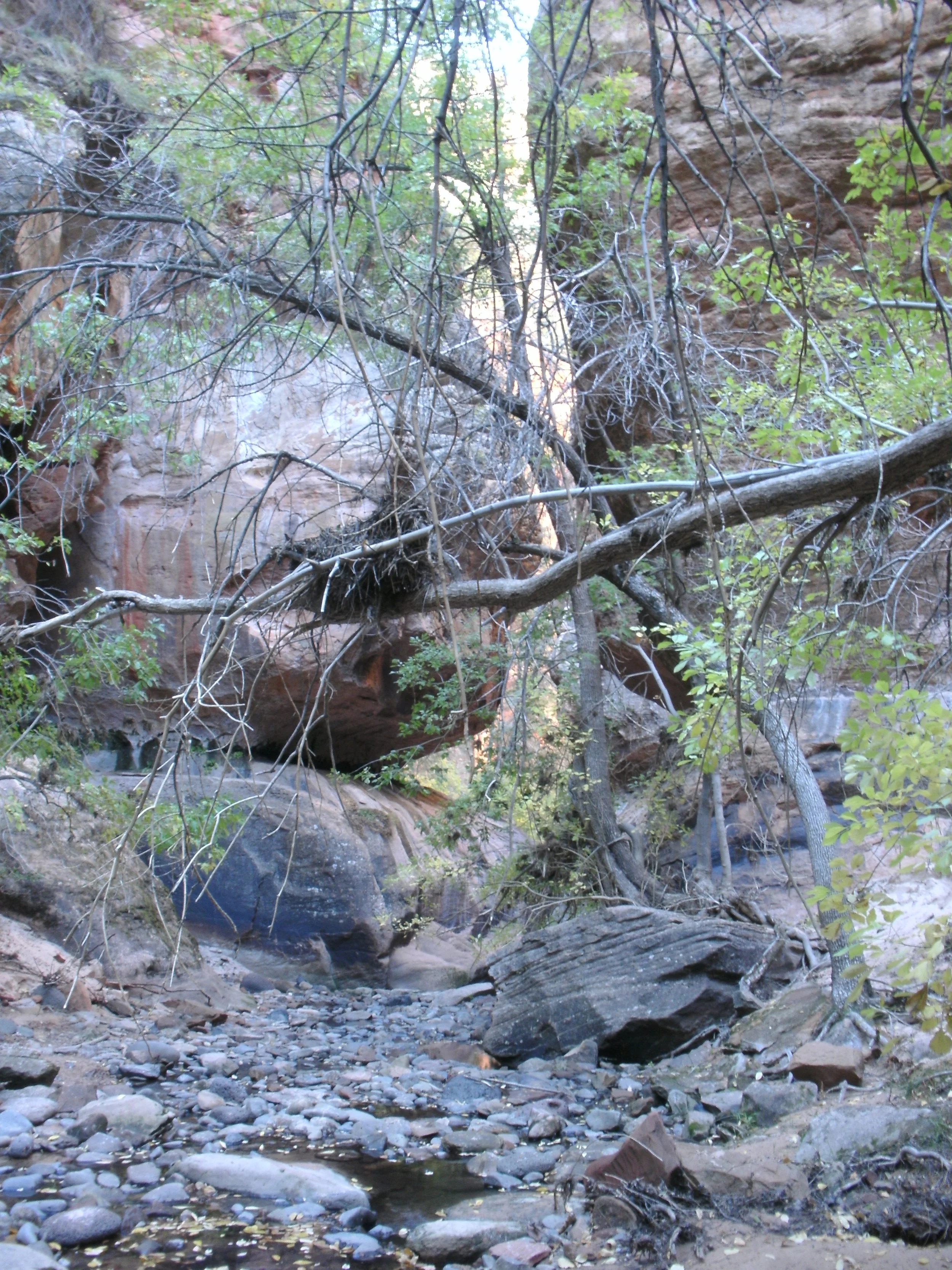 Finally! I see a small cairn off the next little rise, then another, and another. I'm on the right track. Dropping into the Subway, I am impressed that someone could find a way down. Trying to follow the cairns, I backtrack several times only to find that the trail is now dropping into a different wash, then up and over and into another wash again. It is a jigsaw puzzle of wash, gullies and ridge lines. I arrive at the canyon's edge. Beautiful. But I've lost my way down again, backtracking I note another small trail, up and over and down into another canyon again. So I continue to push my way through the tangle of trees, scrub oak, and bush. Slipping, sliding, hanging on to anything growing, I stumble out into the river bottom. Wow.