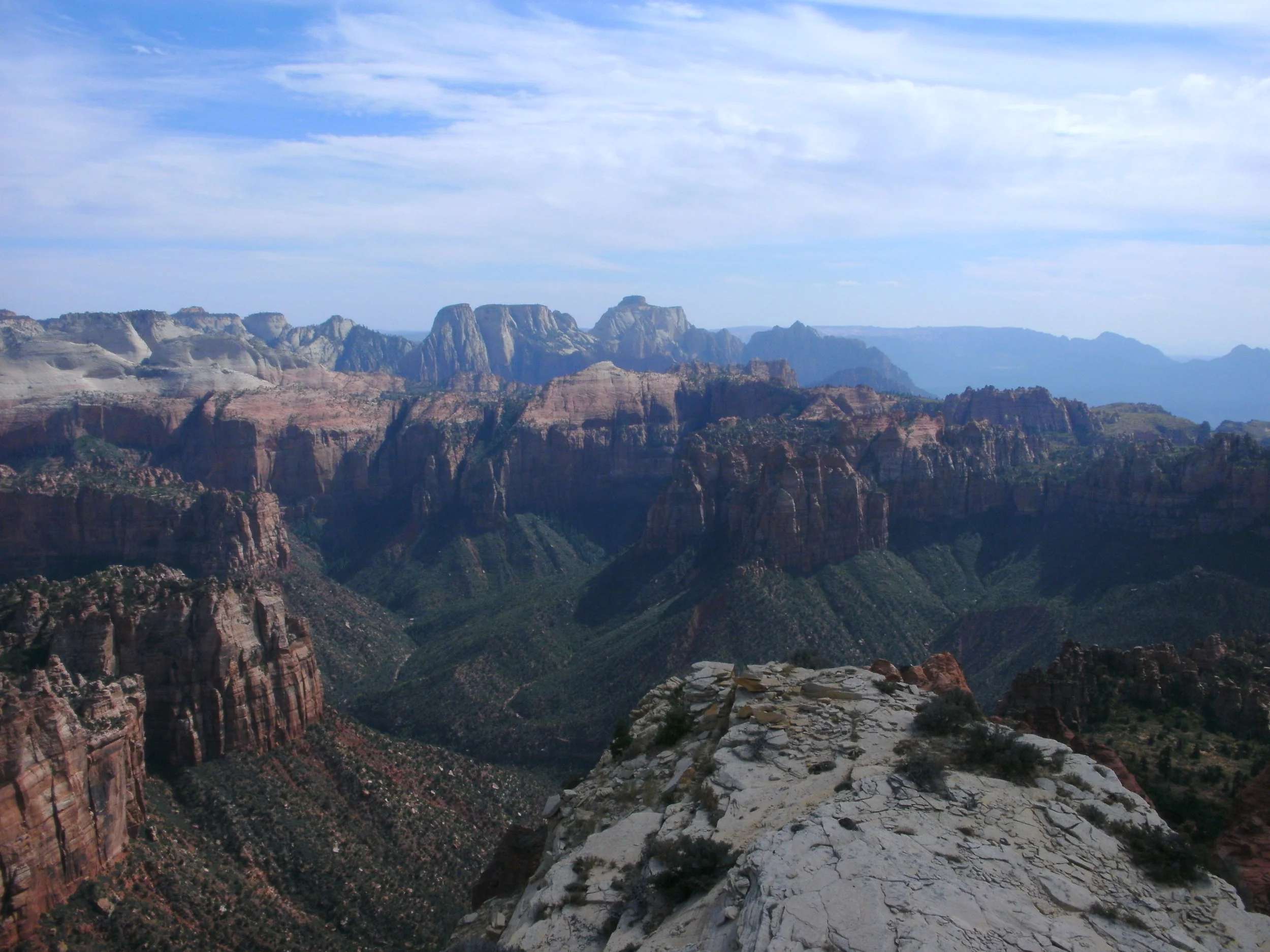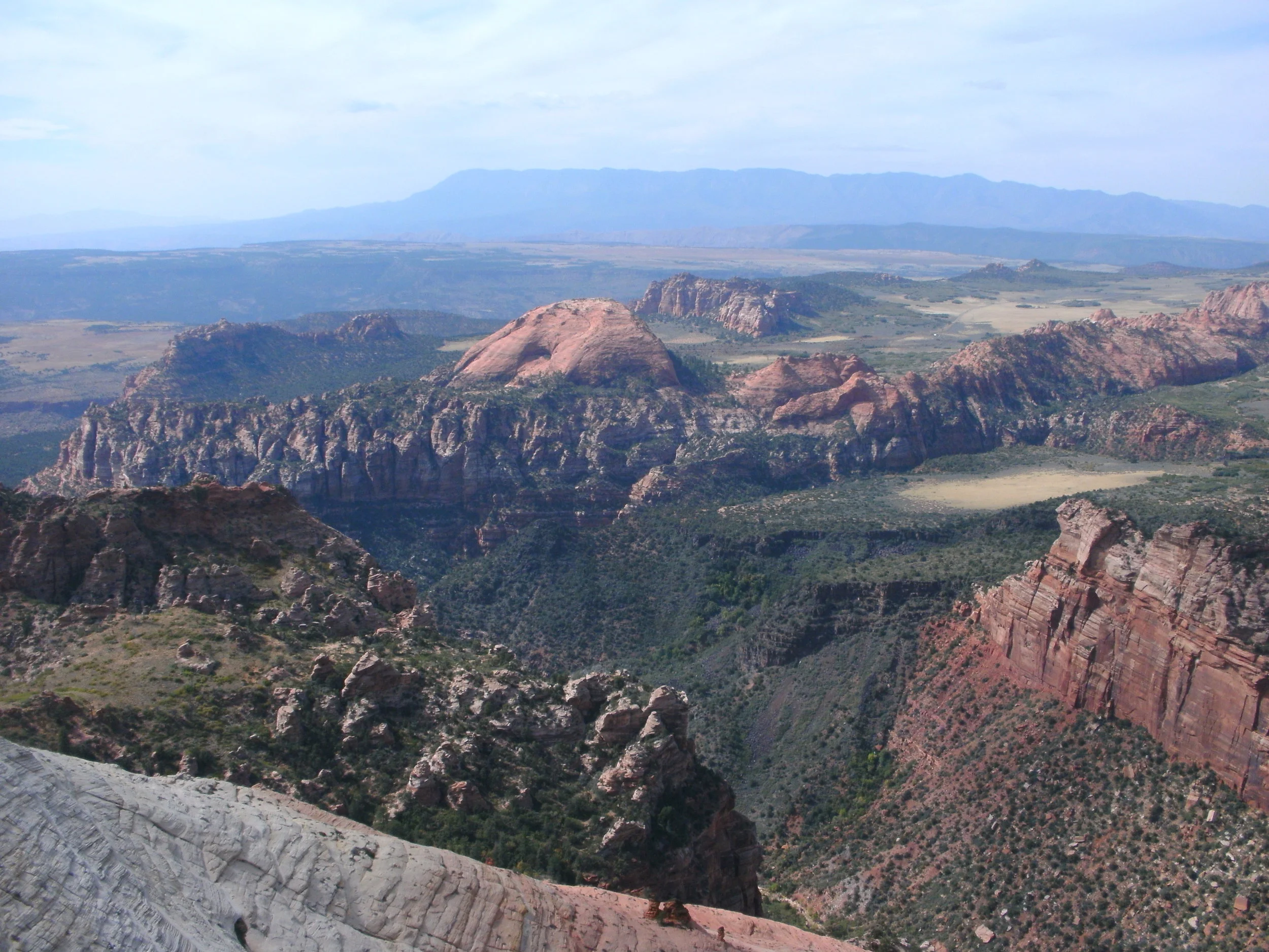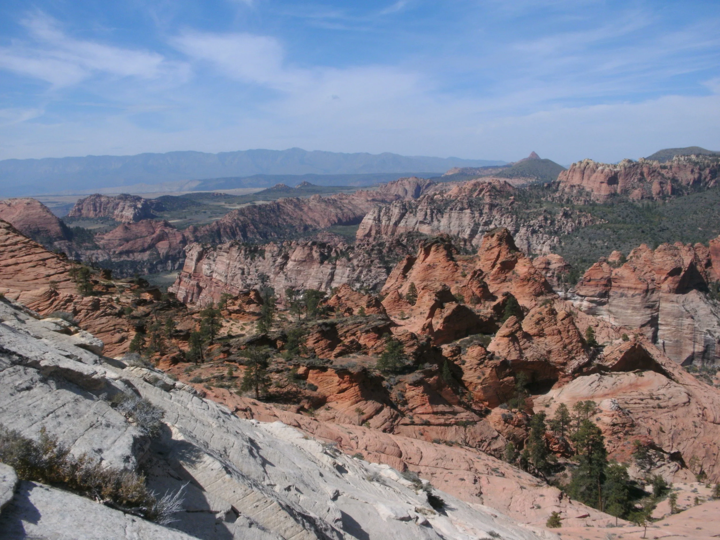 The Slickrock bowls are class 3 scramble, good shelf systems allow for access. Be sure to look behind you at the changing landscape, several entrance points exist and you don't want to drop all the way to the bottom of the wash to exit. At the ridge line I was unprepared for the sight that awaited me. Looking over the entire Kolob Terrace section of the park is a wonderful sight.