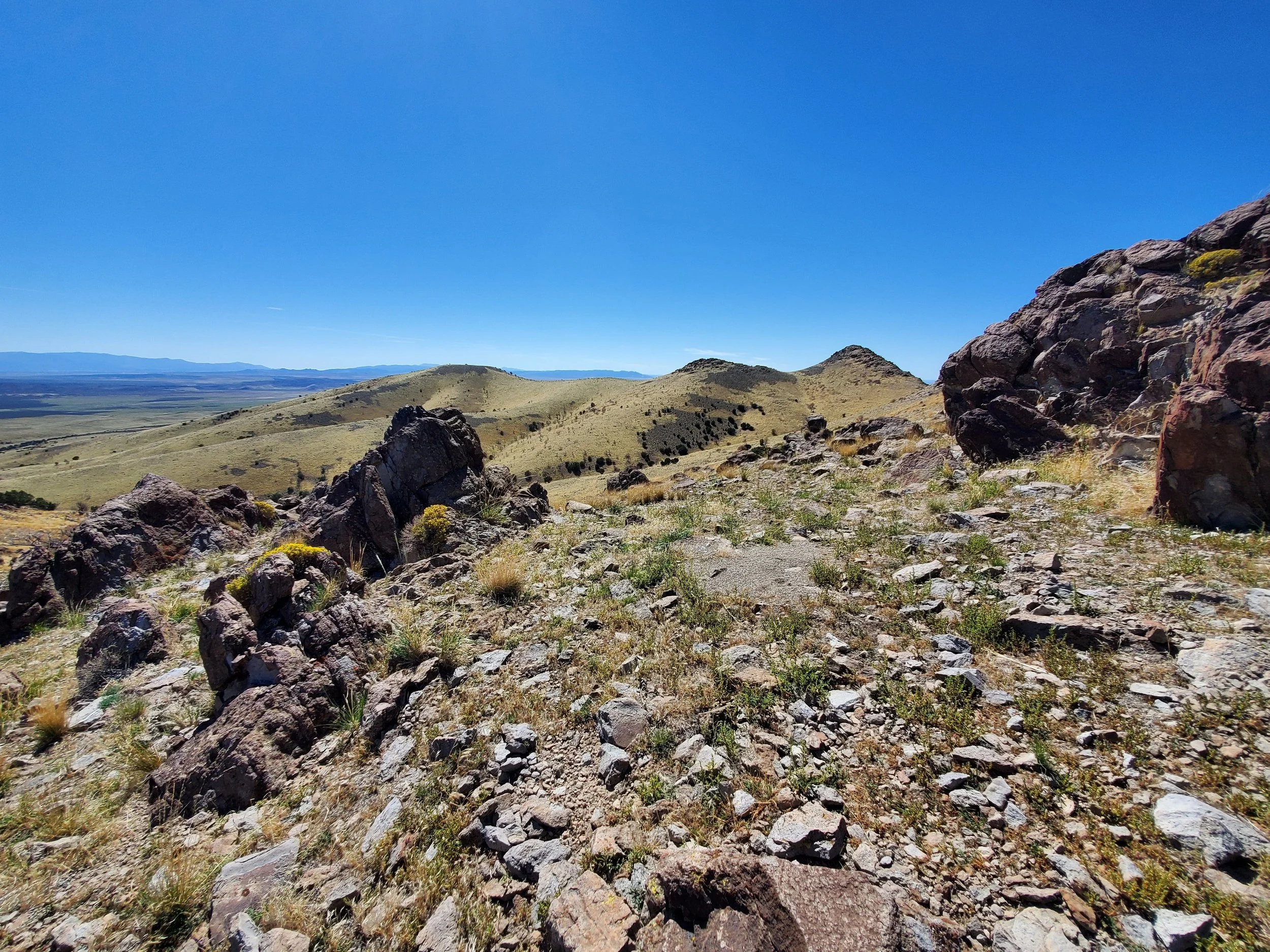 The valley rises slowly toward a small knoll just south of Monument Peak, providing a gentle rise covered in the dry brown grass. Two prominent rocky peaks emerge from the ridgeline before rising dramatically toward the summit. I'm excited as I park the Fj at the end of the road among Juniper trees. Unfortunately, a significant fire has burned through the area, later chained and replanted with grass to help protect the soil and control weeds. The Bureau of Land Management has done an excellent job with this section of land. Fortunately, I suspect the road I just traveled was a fire road or a reclaiming road cut to reseed the area.