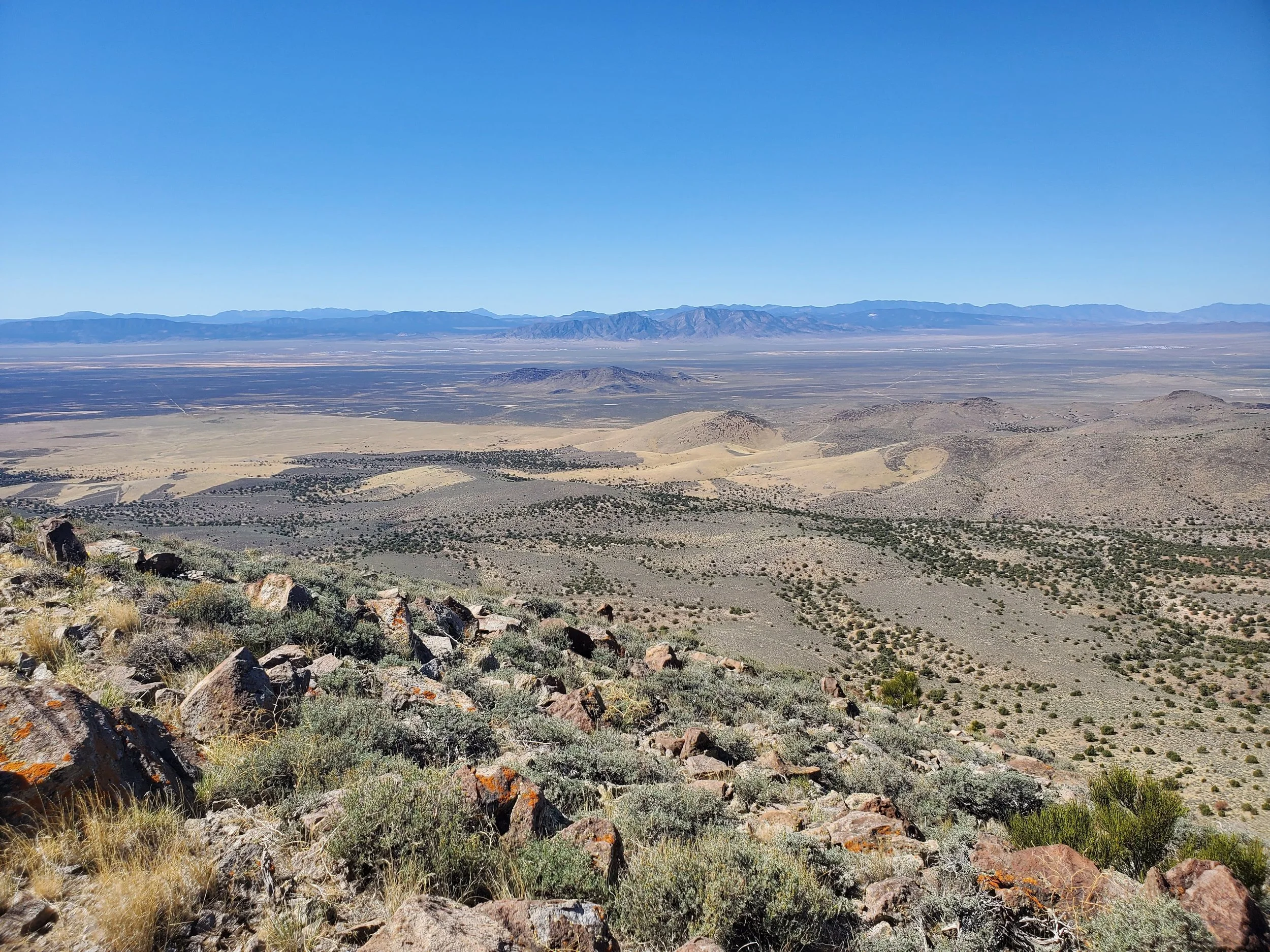 I choose instead to spend more time on the summit, drinking in the fresh air and the fantastic views. Next, I descend along the more northern ridge line, which also heads east, this ridgeline appearing less steep from my vantage spot across the vast chasm between the two. It is easier to traverse, and I make my way back along the wash separating the Monument Peak range from the mountains to the east. The return trip takes 1h:06m as I drop my pack into the Jeep. Hoping to sit in the cool shade and rest, buzzing flies bring that to a quick end, and I settle for the air conditioning of the Fj as I make my way back along the road.