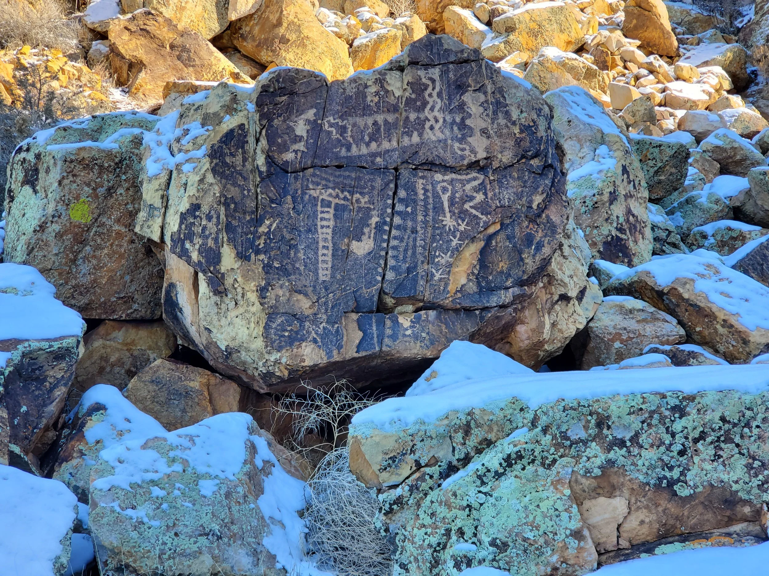 There is an abundant number of panels covered in petroglyphs (1), and I take more than a few pictures trying to capture the majesty of the moment. It is quiet and surreal as I walk among the historical landmarks. I'm warm, thanks to my ski bibs and coat, as I circle back to the south side of the roadway and get a closer look at the graphs that are not behind iron rails.